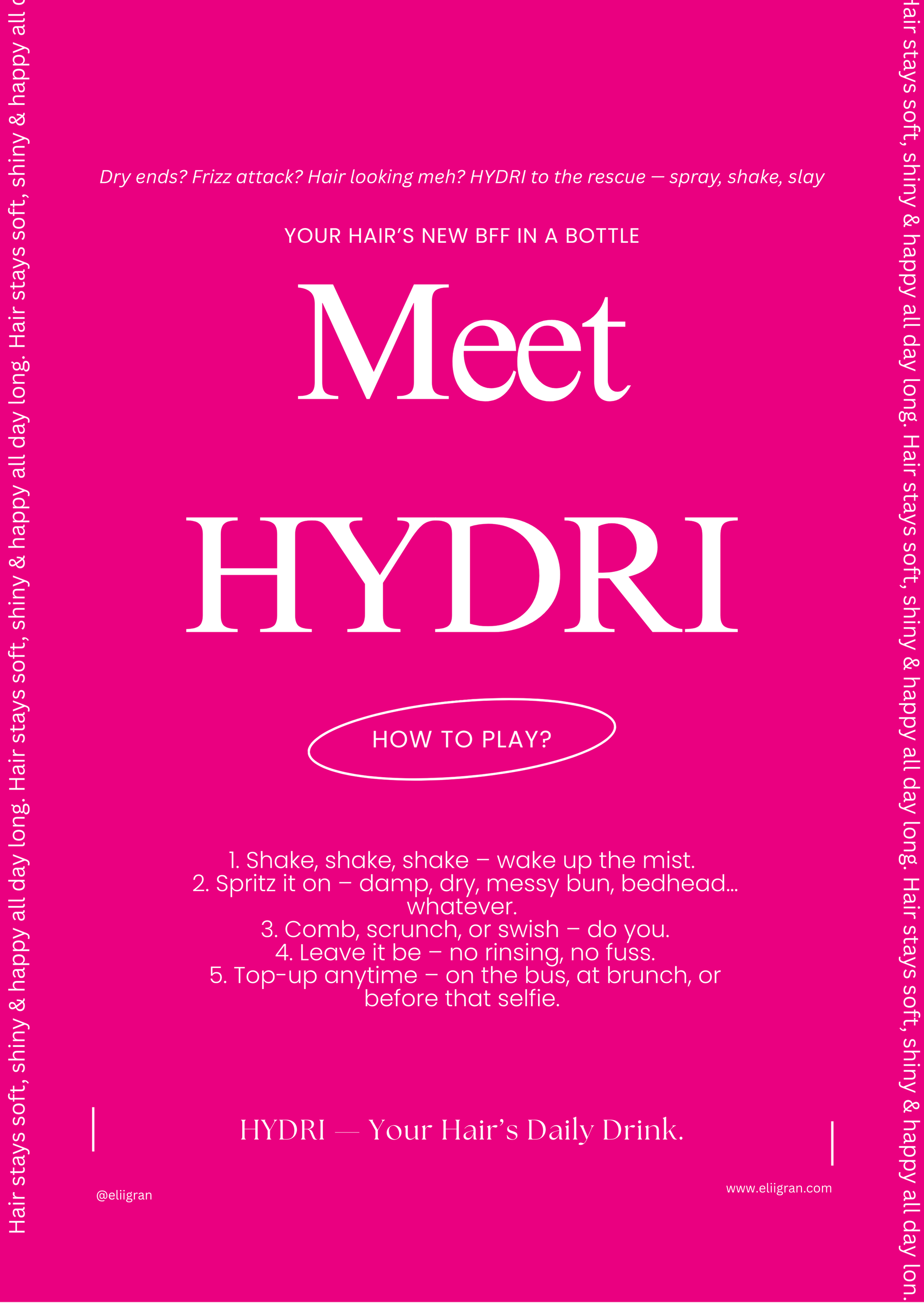 HYDRI Protein Hydration Mist is a vegan-friendly daily treat for your hair — restoring moisture, boosting strength, and protecting against everyday dryness from wind, heat, or sun. Packed with Panthenol (Pro-Vitamin B5) to deeply hydrate, smooth, and seal the hair’s surface, it leaves strands soft, shiny, and manageable.